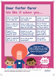 M.A.D grouped responses into common themes and worked with a graphic designer to create three separate ‘Dear Worker….’ posters and leaflets. The posters let workers know what children and young people enjoy doing with them, and how best to work with them. They have also created a video which is shared with new social workers and ASYE during their induction.